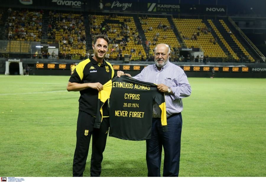 Συγκίνηση πριν την έναρξη του φιλικού ανάμεσα στον Άρη και τον Εθνικό Άχνας καθώς οι παίκτες των δύο ομάδων τίμησαν τη... μαύρη επέτειο από την τουρκική εισβολή στην Κύπρο.