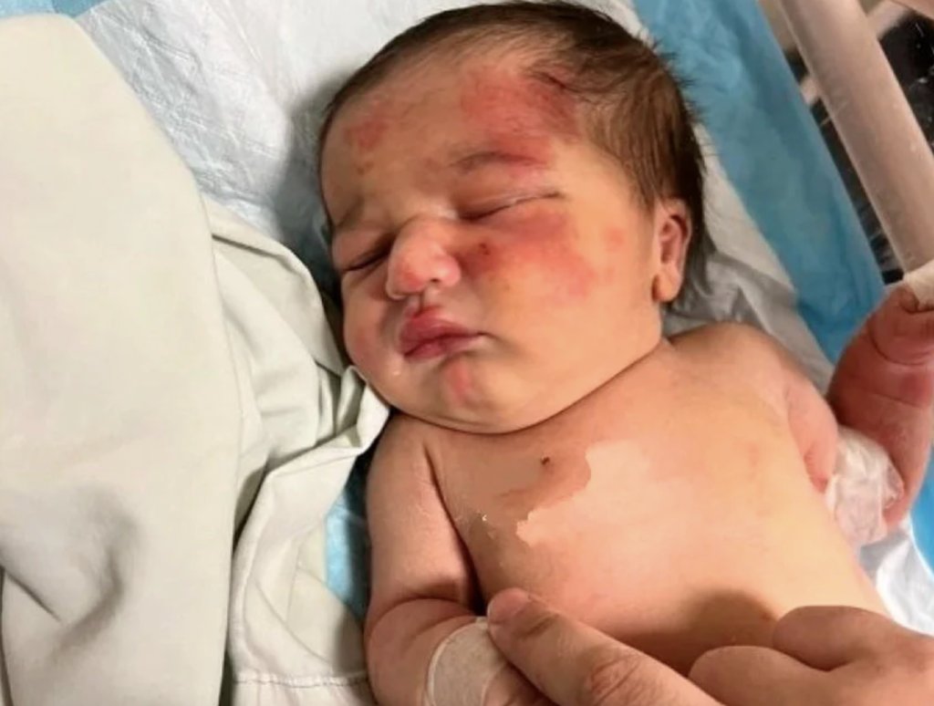 Εικόνες που δημοσιεύτηκαν στα μέσα κοινωνικής δικτύωσης δείχνουν το μωρό, που φαίνεται να είναι περίπου 4 μηνών, να έχει μώλωπες στο πρόσωπο και το σώμα του.