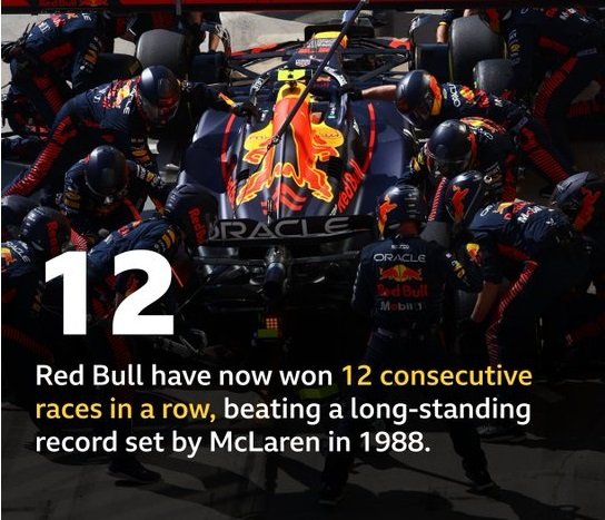 Ένα εκπληκτικό ρεκόρ πέτυχε η Red Bull στο GP της Ουγγαρίας. Η αυστριακή ομάδα είδε για 12ο συνεχόμενο Γκραν Πρι ένα από τα μονοθέσιά της να τερματίζουν στην πρώτη θέση. Έσπασε έτσι προηγούμενη καλύτερη επίδοση που είχε επιτευχθεί πριν 35 ολόκληρα χρόνια.