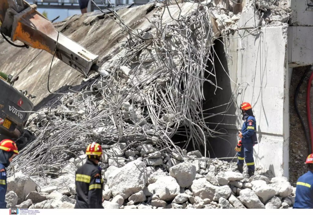 Άνδρες της ΕΜΑΚ και πυροσβέστες ερευνούν τα συντρίμμια της γέφυρας στην Πάτρα, μετά την απομάκρυνση βαρέων μηχανημάτων που βρίσκονταν πάνω από το τμήμα που κατέρρευσε, σκοτώνοντας έναν άνθρωπο και τραυματίζοντας 14.