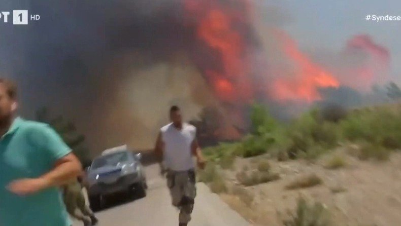 Σήμερα (25/7) με την φωτιά να μαίνεται στη Ρόδο, το συνεργείο της ΕΡΤ βρισκόταν σ' ένα από τα σημεία που καιγόταν όταν η πυρκαγιά τους πλησίασε τόσο πολύ που άρχισαν να τρέχουν. Συγκεκριμένα, φαίνονται ο απεσταλμένος της ΕΡΤ Κώστας Νούσης, ο οπερατέρ Γιώργος Κορδονούλης και η ηχολήπτρια Παναγιώτα Δερβιτσιώτη με φόντο τις απειλητικές φλόγες του πύρινου μετώπου που μαίνεται δίπλα στο Βάτι της Ρόδου, οι οποίοι έφυγαν για να σωθούν.
