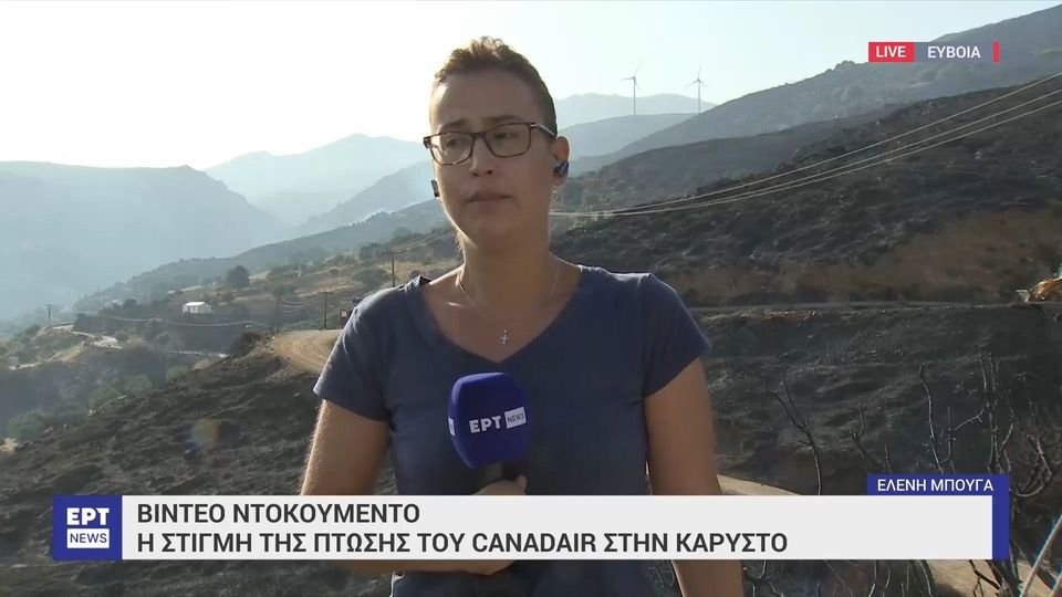 Σε σοκ και πένθος βρίσκεται το πανελλήνιο μετά την είδηση της πτώσης του Canadair στην Κάρυστο, η οποία οδήγησε στον θάνατο των δύο χειριστών, όπως επιβεβαίωσε το Γενικό Επιτελείο Αεροπορίας. Η Ελένη Μπουγά, δημοσιογράφος της ΕΡΤ που ανέλαβε να εξηγήσει στον αέρα το τι ακριβώς διαδραματίστηκε, δεν άντεξε και ξέσπασε σε λυγμούς, περιγράφοντας την ηρωική προσπάθεια των δύο αδικοχαμένων χειριστών να βοηθήσουν στην κατάσβεση της φωτιάς.