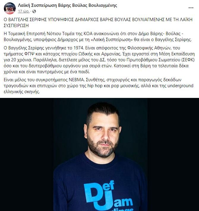 «H Τομεακή Επιτροπή Νότιου Τομέα της ΚΟΑ ανακοινώνει ότι στον Δήμο Βάρης- Βούλας - Βουλιαγμένης, υποψήφιος Δήμαρχος με τη «Λαϊκή Συσπείρωση» θα είναι ο Βαγγέλης Σερίφης.