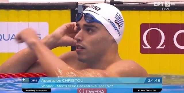 Ο Απόστολος Χρήστου, ο οποίος για τρίτη διαδοχική φορά στην τεράστια καριέρα του αγωνίστηκε στον τελικό του Παγκοσμίου πρωταθλήματος στα 50μ ύπτιο, κατέλαβε την 6η θέση σε χρόνο 24.60'.