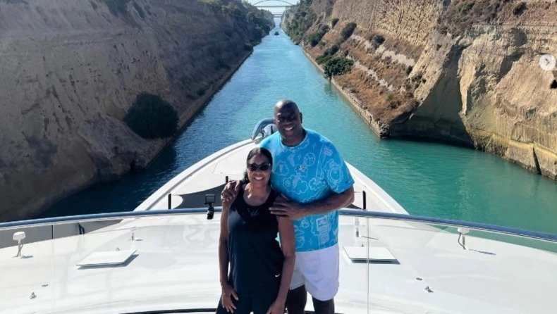 Πάνω στο υπερπολυτελές γιοτ, που τους φιλοξενεί, ο Μάτζικ Τζόνσον και η οικογένειά του διέσχισαν τη διώρυγα της Κορίνθου.