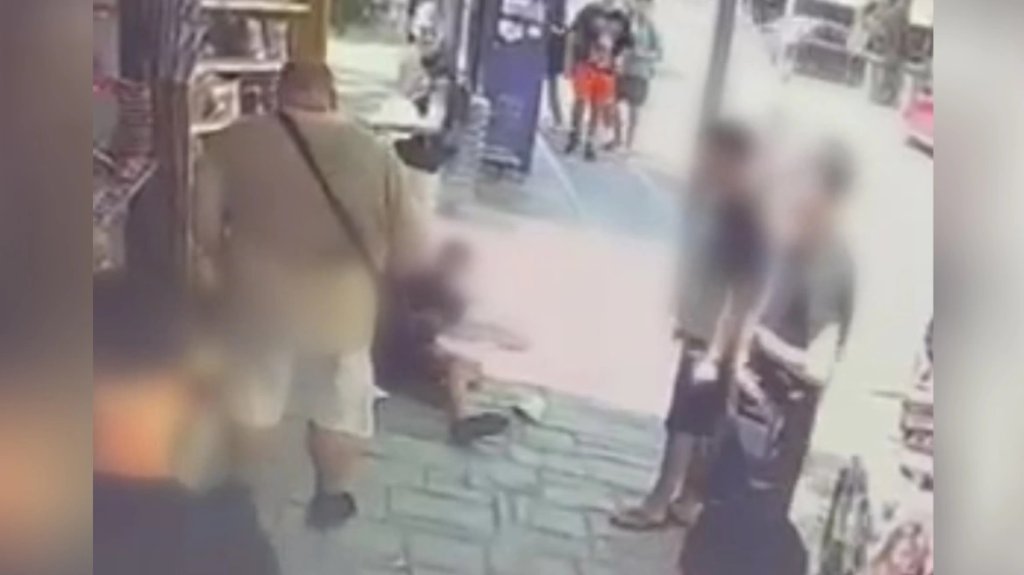 Μερικά δευτερόλεπτα αργότερα ο μεσήλικας σπρώχνει με δύναμη τον ανήλικο και τον ρίχνει στο ράφι με τα προϊόντα του περιπτέρου, ενώ μόλις ο νεαρός πέφτει στο έδαφος εκείνος στέκεται σχεδόν από πάνω του και του φωνάζει σε έξαλλη κατάσταση.
