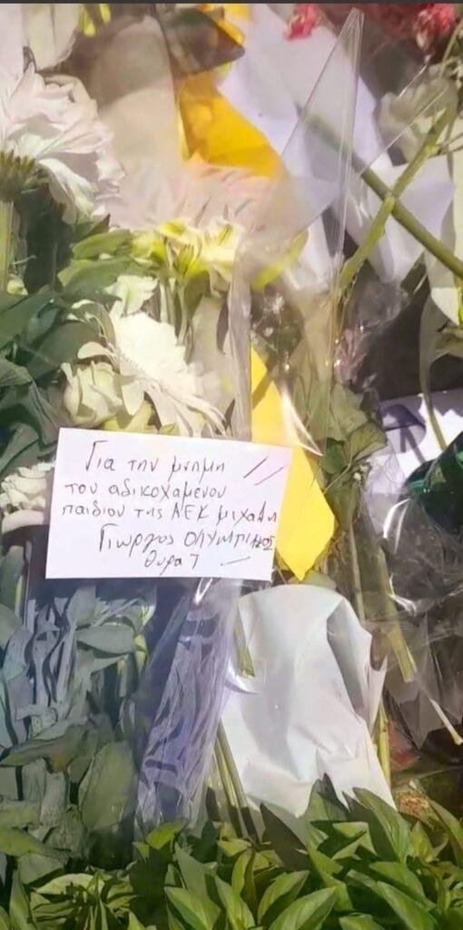 Πολύς κόσμος έχει περάσει αυτές τις ημέρες και αφήνει ένα λουλούδι στο σημείο που έφυγε ο Μιχάλης. Μεταξύ αυτών και ένας φίλος του Ολυμπιακού, ο Γιώργος, ο οποίος άφησε ένα λουλούδι στη μνήμη του και μαζί ένα σημείο που έγραψε: «Για τη μνήμη του αδικοχαμένου παιδιού της ΑΕΚ, Μιχάλη. Γιώργος, Ολυμπιακός, θύρα 7».