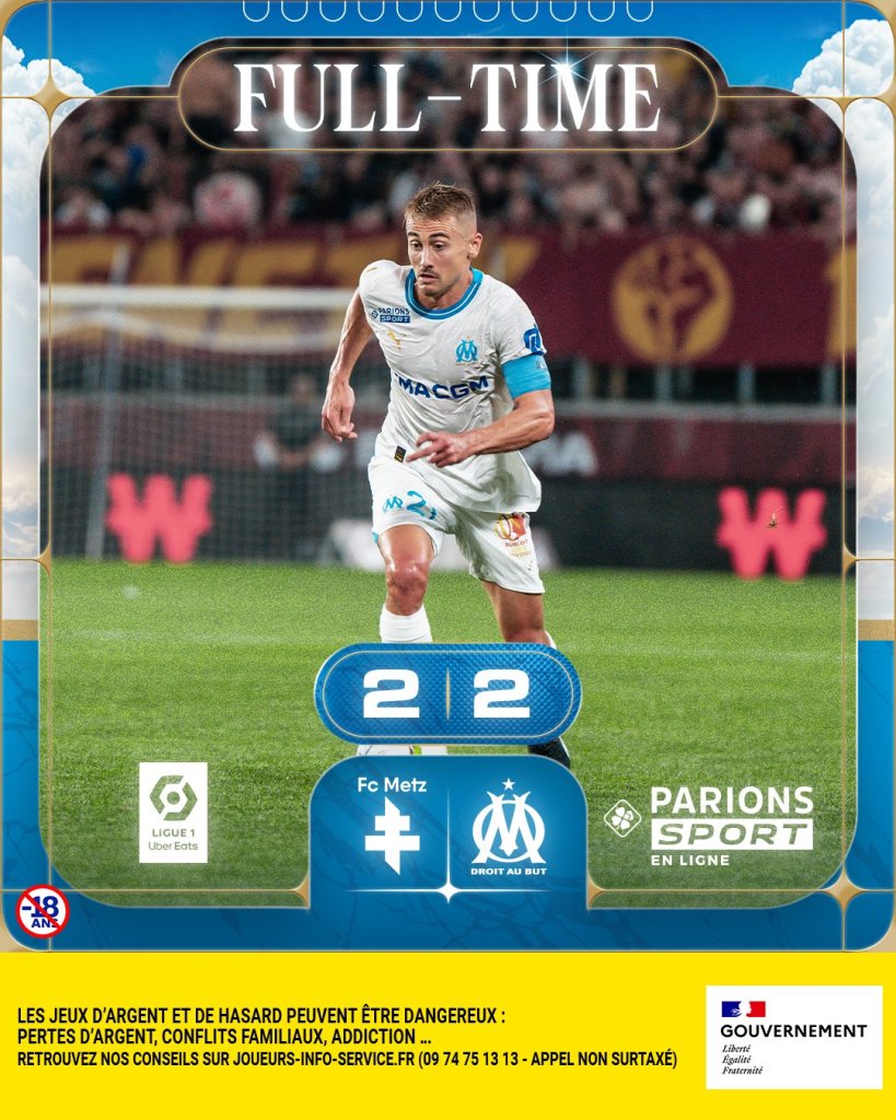 Λίγες μέρες μετά τον αποκλεισμό από τον Παναθηναϊκό για το Champions League, η Μαρσέιγ έσωσε τον βαθμό (2-2) απέναντι στη Μετς, η οποία αγωνιζόταν από το 59ο λεπτό με παίχτη λιγότερο! Έτσι, οι Μασσαλοί πήγαν στο 4 βαθμούς, ενώ αυτός ήταν ο πρώτος βαθμός για τη Μετς στη φετινή Ligue 1.