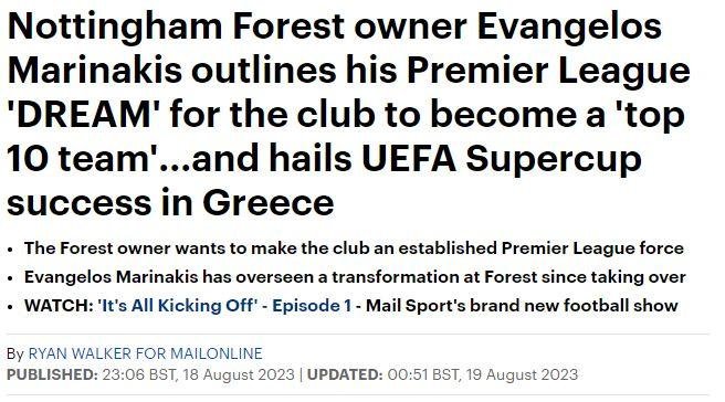 Στην πορεία σχετικά με το Super Cup που φιλοξενήθηκε στο Καραϊσκάκης, στο άρθρο υπογραμμίζεται: «Ο 56χρονος (σ.σ Βαγγέλης Μαρινάκης) είναι αποφασισμένος να ανεβάσει το προφίλ του ελληνικού ποδοσφαίρου και να κάνει τη χώρα ένα hotspot υποδοχής μεγάλων αθλητικών γεγονότων.