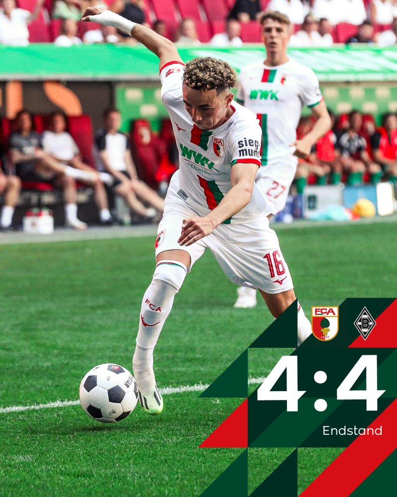 Μάλιστα στο 45+7’ η Άουγκσμπουργκ ισοφάρισε σε 3-3 με εύστοχη εκτέλεση πέναλτι του Μίχελ. Στο 56’ η προσπάθεια του Πλέα πέρασε μόλις άουτ και στο 76’ οι γηπεδούχοι έκαναν το 4-3 με εξαιρετικό διαγώνιο σουτ του Βάργκας, έπειτα από πάσα του Τιέτς. Στο 90+6’ η Γκλάντμπαχ κέρδισε πέναλτι. Ο Τσβαντσάρα ανέλαβε την εκτέλεση και διαμόρφωσε το τελικό 4-4.