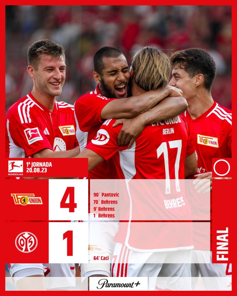 Με τον Κέβιν Μπέρενς να κάνει χατ τρικ με τρεις κεφαλιές(!), η Ουνιόν Βερολίνου κέρδισε με 4-1 τη Μάιντς και ξεκίνησε με τον καλύτερο τρόπο τις υποχρεώσεις της στο πρωτάθλημα. Δύο χαμένα πέναλτι για την Μάιντς.