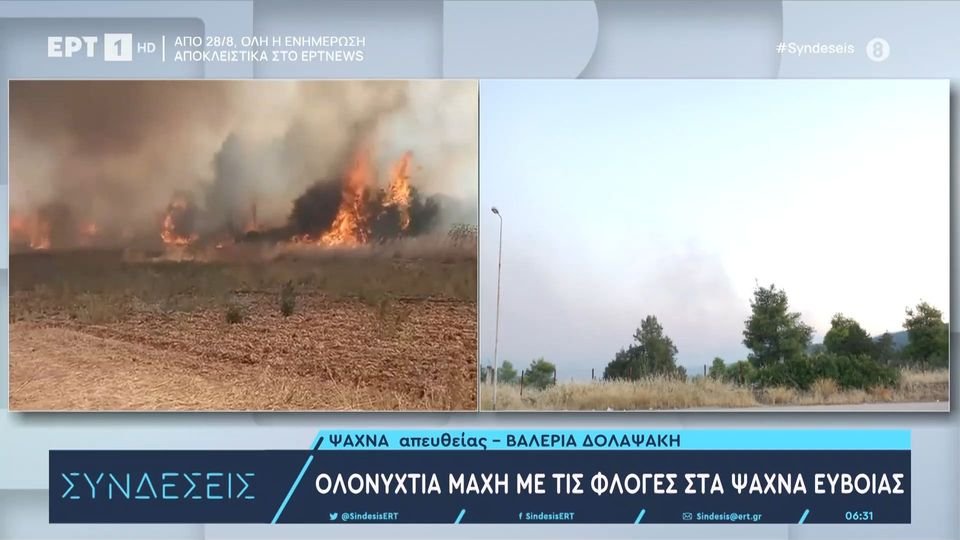 Οι ισχυροί άνεμοι που εξακολουθούν να πνέουν δεν επέτρεψαν ουσιαστικές παρεμβάσεις στις επίγειες δυνάμεις της πυροσβεστικής να περιορίσουν τη φωτιά που κατακαίει την περιοχή, με αποτέλεσμα όλο το βουνό πάνω από τη Νέα Αρτάκη να έχει παραδοθεί στις φλόγες.