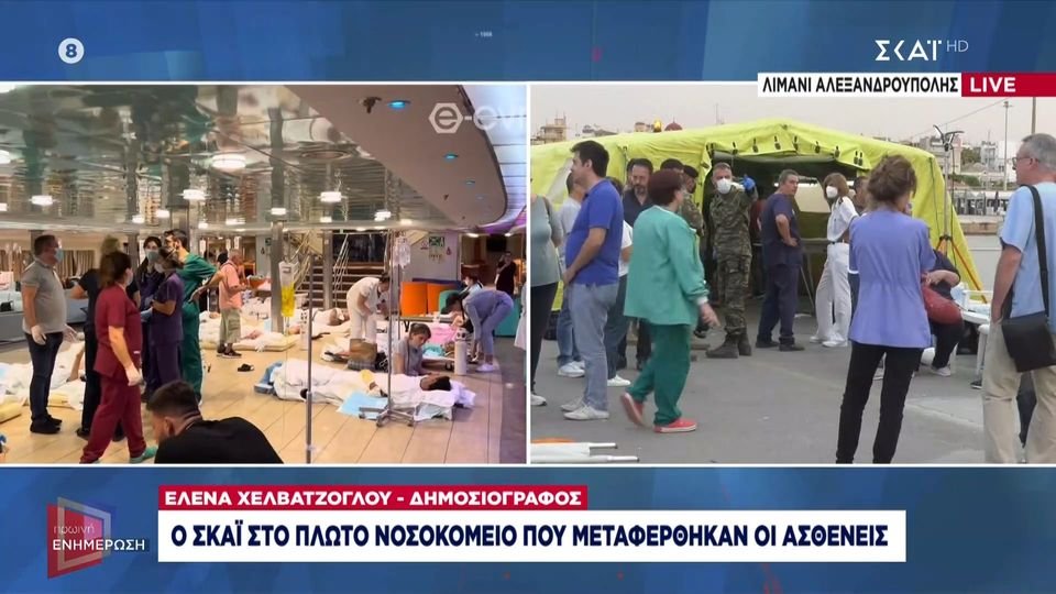 Όπως φαίνεται σε βίντεο του e-evros.gr από το Λιμάνι της Αλεξανδρούπολης, το «Αδαμάντιος Κοραής» έχει μετατραπεί σε προσωρινό νοσοκομείο μετά την εκκένωση του Πανεπιστημιακού Γενικού Νοσοκομείου της πόλης (ΠΓΝΑ). Σύμφωνα με το Λιμενικό, 65 ασθενείς έχουν μεταφερθεί με ασφάλεια εντός του επιβατηγού οχηματαγωγού πλοίου «Αδαμάντιος Κοραής».