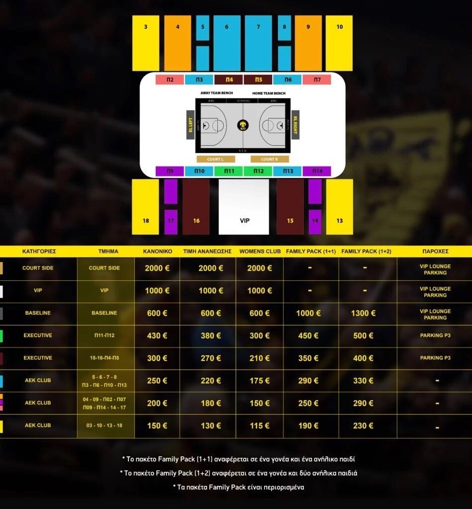 Για την ΑΕΚ BC τα χαμόγελα των παιδιών και η παρουσία τους στο γήπεδο συνιστούν βασική προτεραιότητα. Γι’ αυτό καλούμε όλες τις οικογένειες να αξιοποιήσουν τα οικογενειακά πακέτα στις προνομιακές τιμές για τα Τμήματα EXECUTIVE και AEK CLUB και BASELINE (Η παραπάνω προσφορά ισχύει για παιδιά έως 17 ετών).