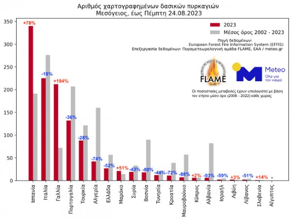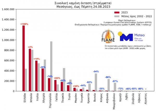 Καταγράφοντας 1.281.480 στρέμματα καμένων εκτάσεων έως την Πέμπτη 24.08.2023, η Ελλάδα κατατάσσεται με διαφορά πρώτη μεταξύ 20 Μεσογειακών χωρών. Δεύτερη έρχεται η Ισπανία με 824.640 στρέμματα και τρίτη η Ιταλία με 595.330 στρέμματα. Αύξηση των καμένων εκτάσεων καταγράφουν επίσης η Γαλλία (+66%) και το Μαρόκο (+30%), ενώ μείωση καταγράφεται στις υπόλοιπες χώρες.