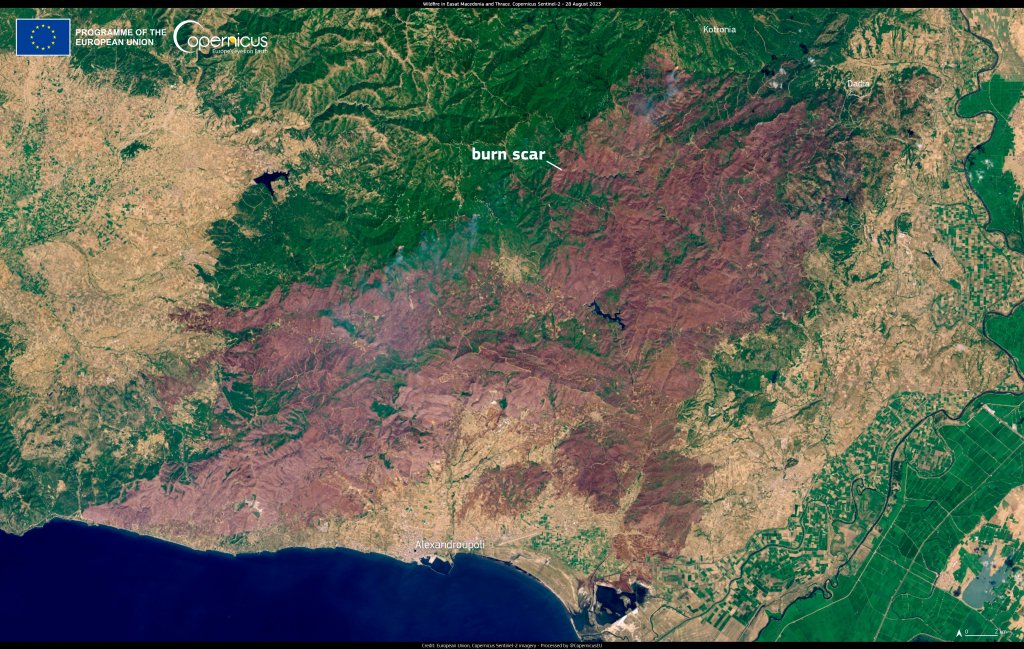 H καμένη έκταση στην τελευταία ανανέωση από την Υπηρεσία Ταχείας Χαρτογράφησης Copernicus, ανήλθε στα 812.600 στρέμματα (έως την 29.08.2023, 12:03 τοπική ώρα). Από τη συνολική καμένη έκταση των 812.600 στρεμμάτων, τα περίπου 650.000 στρέμματα κάηκαν το τριήμερο 21-23 Αυγούστου.