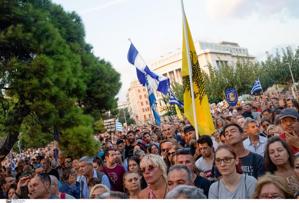 Πολλές είναι οι ελληνικές σημαίες, ενώ δεν λείπουν τα ακροδεξιά σύμβολα. Αξίζει να σημειωθεί ότι διαδηλωτές έφτασαν από μια σειρά περιοχές της βόρειας Ελλάδας, ενώ αντίστοιχο συλλαλητήριο αναμένεται να πραγματοποιηθεί και στην Αθήνα.