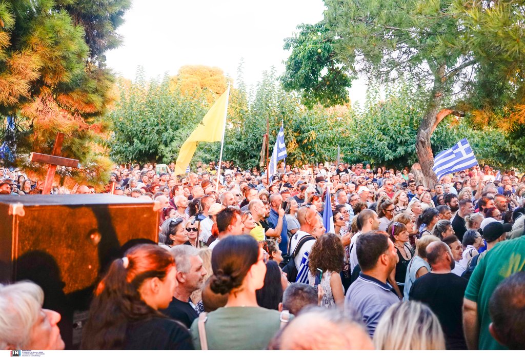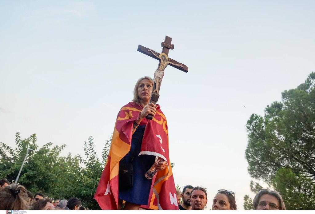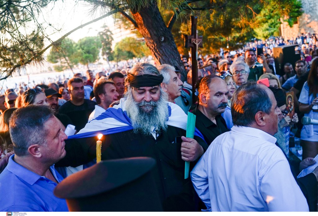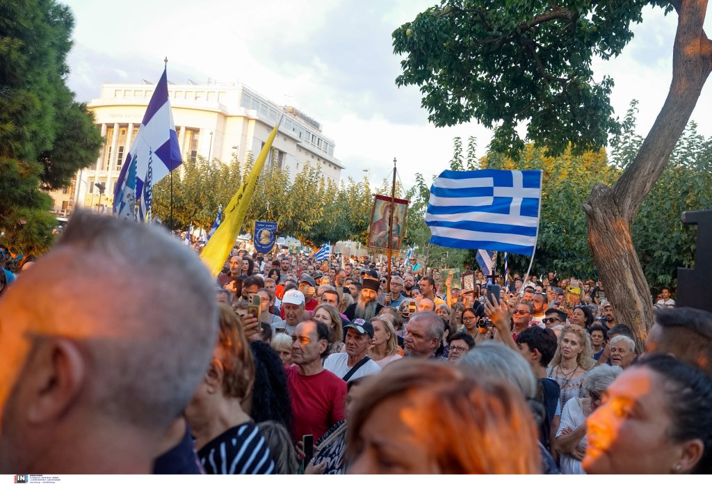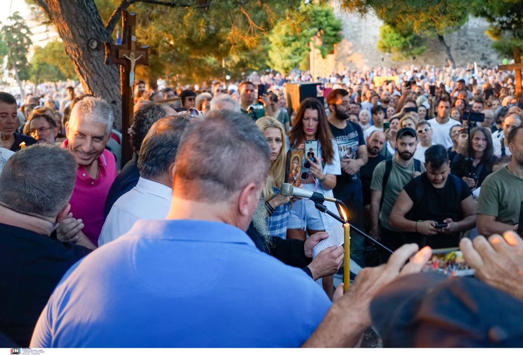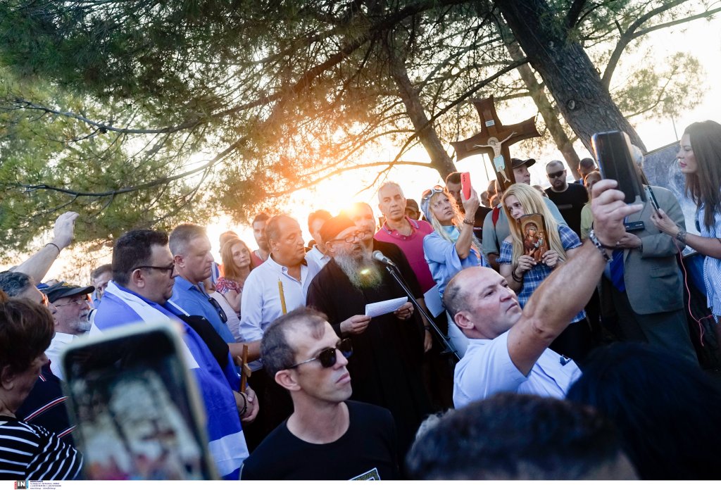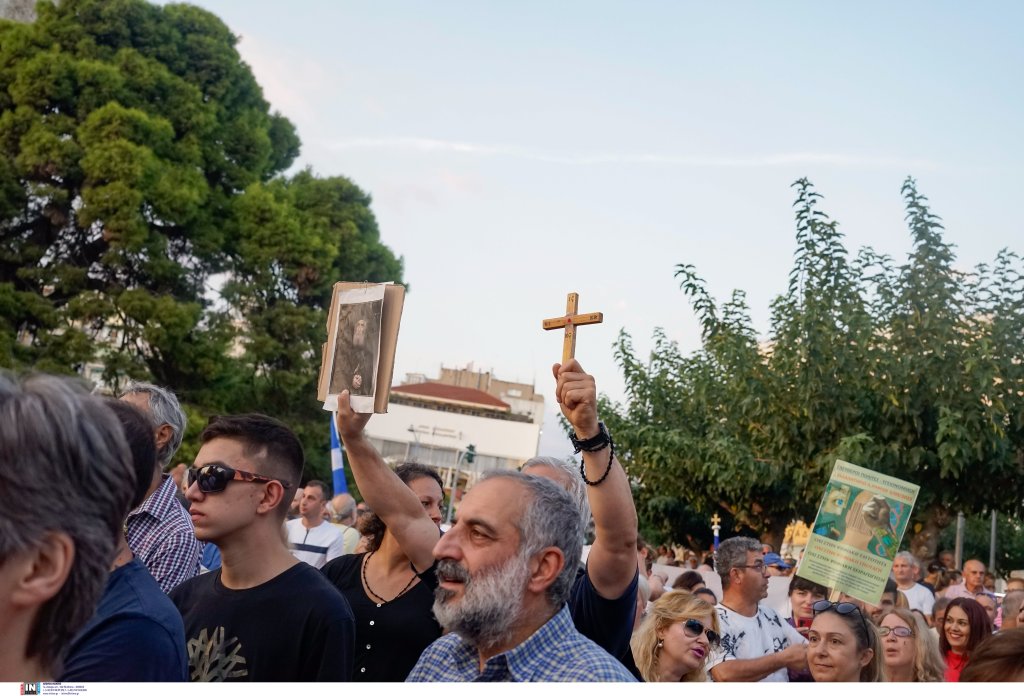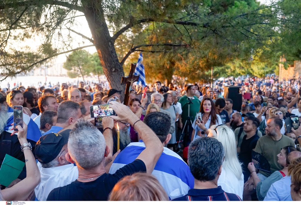 Οι συγκεντρωμένοι, που βρέθηκαν αρχικά στον Λευκό Πύργο, κρατούν εικόνες και σταυρούς, ενώ μιλούν για «χάραγμα του αντίχριστου» και «νέο σχέδιο εξαπάτησης του λαού μετά τον κοροναϊό».
