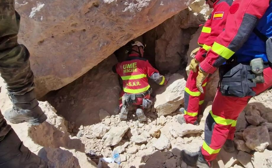 Πλάνα από το απομονωμένο χωριό Ίμι Ν’Τάλα, που τράβηξε ο Ισπανός διασώστης Αντόνιο Νογάλες, της ομάδας διάσωσης «Ενωμένοι Πυροσβέστες Χωρίς Σύνορα», δείχνουν άνδρες και σκύλους σκαρφαλωμένους σε απότομους λοφίσκους, καλυμμένους με συντρίμμια.