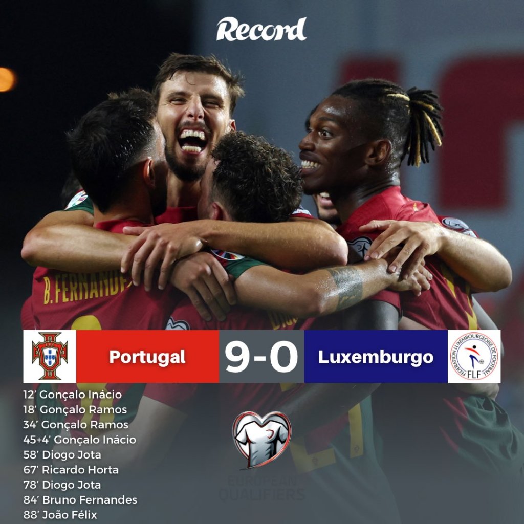 Η Πορτογαλία συνέχισε την αήττητη πορεία της στα προκριματικά του Euro(6Χ6) και χωρίς τον Κριστιάνο Ρονάλντο, καθώς διέσυρε με 9-0 το Λουξεμβούργο και πλέον βρίσκεται με το ενάμισι πόδι στα τελικά της διοργάνωσης.