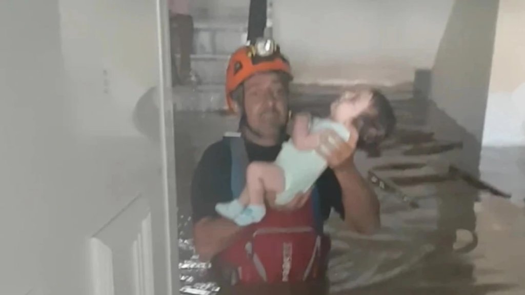 Στο συγκεκριμένο βίντεο ένας άντρας της ΕΜΑΚ παίρνει στην αγκαλιά του ένα βρέφος, διασχίζοντας την πλημμυρισμένη είσοδο σε σπίτι στη Θεσσαλία. Τα νερά έχουν φτάσει μέχρι την κοιλιά του και κρατώντας το μωράκι το παραδίδει στη μητέρα του, η οποία ξεσπά σε κλάμματα όταν το παίρνει στα χέρια της.
