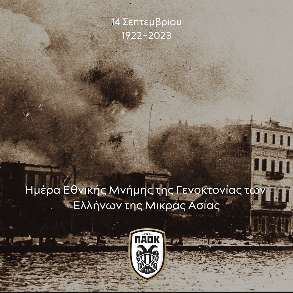 Στα μέσα κοινωνικής δικτύωσης της ΠΑΕ ΠΑΟΚ, έγινε μία ανάρτηση σχετικά με την 14η Σεπτεμβρίου, που είναι η επίσημη μέρα της εθνικής μνήμης της γενοκτονίας των Ελλήνων της Μικράς Ασίας. Το σχετικό μήνυμα της ΠΑΕ ΠΑΟΚ αναφέρει τα ακόλουθα: «Κι αν έγινε πια συνήθεια να μιλάς για την καταστροφή, πάντα να θυμάσαι! Τη μοίρα μέσα στο αίμα σου, τα ανεπούλωτα τραύματα της μνήμης, να τα κρατάς ζωντανά! Να τιμάς αυτούς που γέννησαν ζωή μέσα στη λάσπη και τα καμένα! Ημέρα Εθνικής Μνήμης της Γενοκτονίας των Ελλήνων της Μικράς Ασίας».