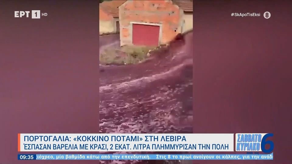 Εκπληκτικές εικόνες στην Πορτογαλία και συγκεκριμένα στην πόλη Λεβίρα, καθώς έσπασαν βαρέλια με κρασί, 2 εκατ. λίτρα πλημμύρισαν τους δρόμους.