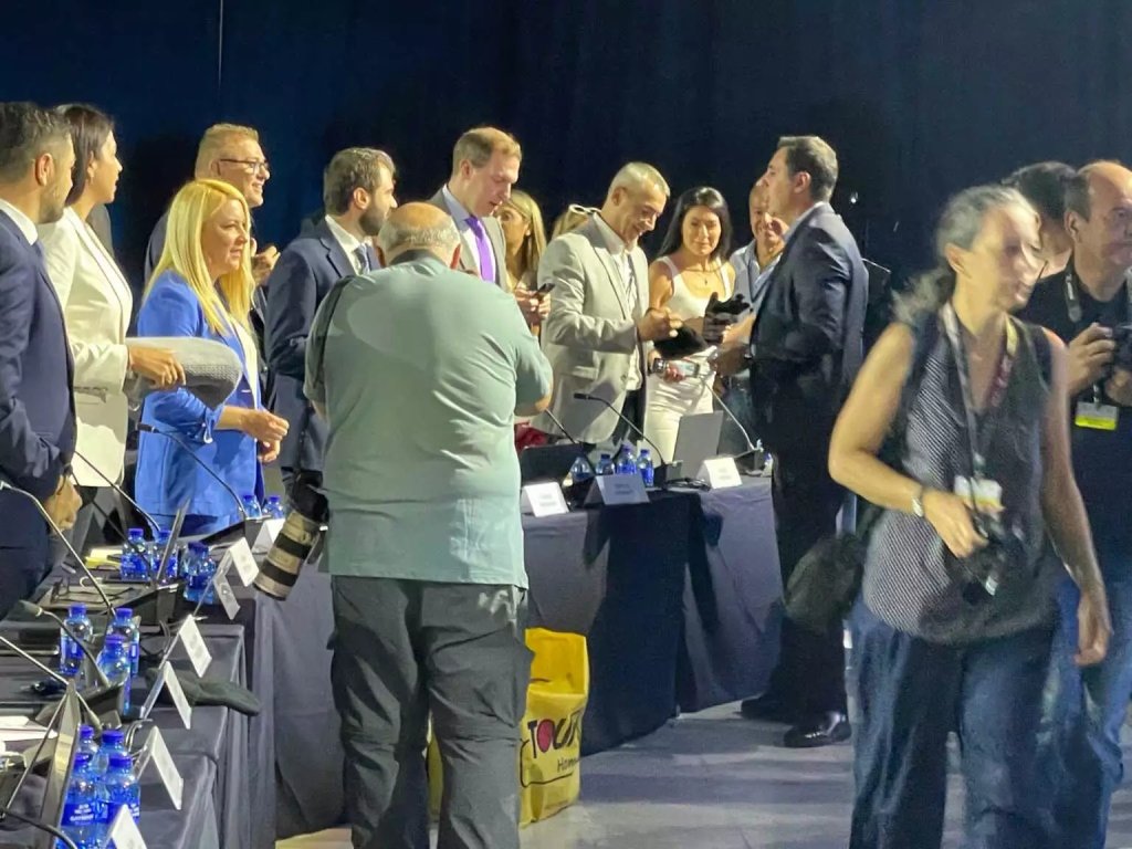 «Σας έφερα γάντια και κουβέρτες γιατί παραπονιέστε», είπε ο Κυριάκος Μητσοτάκης και ο Γιάννης Σμυρλής, ο Γενικός Διευθυντής της ΝΔ, έβγαζε και μοίραζε από μια τσάντα γάντια και κουβέρτες καθώς οι συνθήκες μέσα στην αίθουσα είναι πολικές.