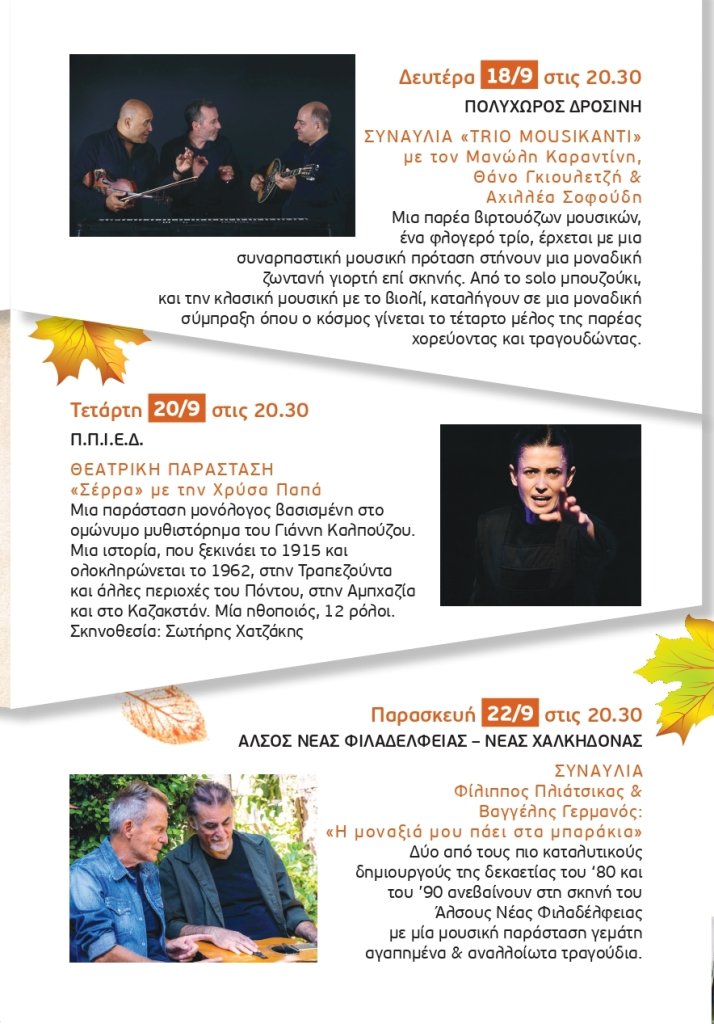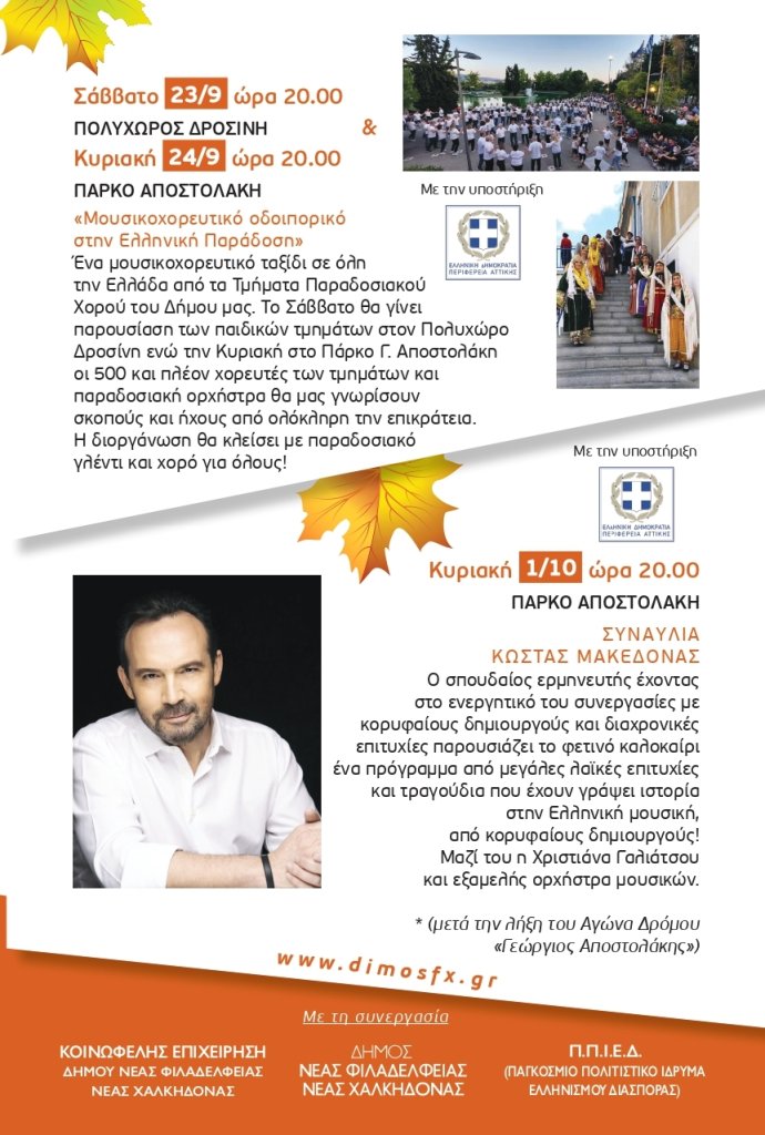 - Το Σάββατο 23/09 και ώρα 20:00 στον Πολυχώρο Δροσίνη και την Κυριακή 24/09 στο Πάρκο Γ. Αποστολάκης στη Νέα Χαλκηδόνα «Μουσικοχορευτικό οδοιπορικό στην Ελληνική Παράδοση».