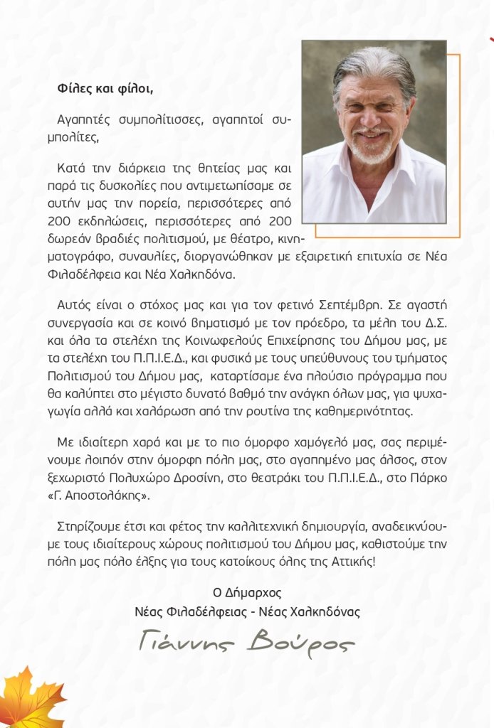 Κατά την διάρκεια της θητείας μας και παρά τις δυσκολίες που αντιμετωπίσαμε σε αυτήν μας την πορεία, περισσότερες από 200 εκδηλώσεις, περισσότερες από 200 δωρεάν βραδιές πολιτισμού, με θέατρο, κινηματογράφο, συναυλίες, διοργανώθηκαν με εξαιρετική επιτυχία σε Νέα Φιλαδέλφεια και Νέα Χαλκηδόνα.