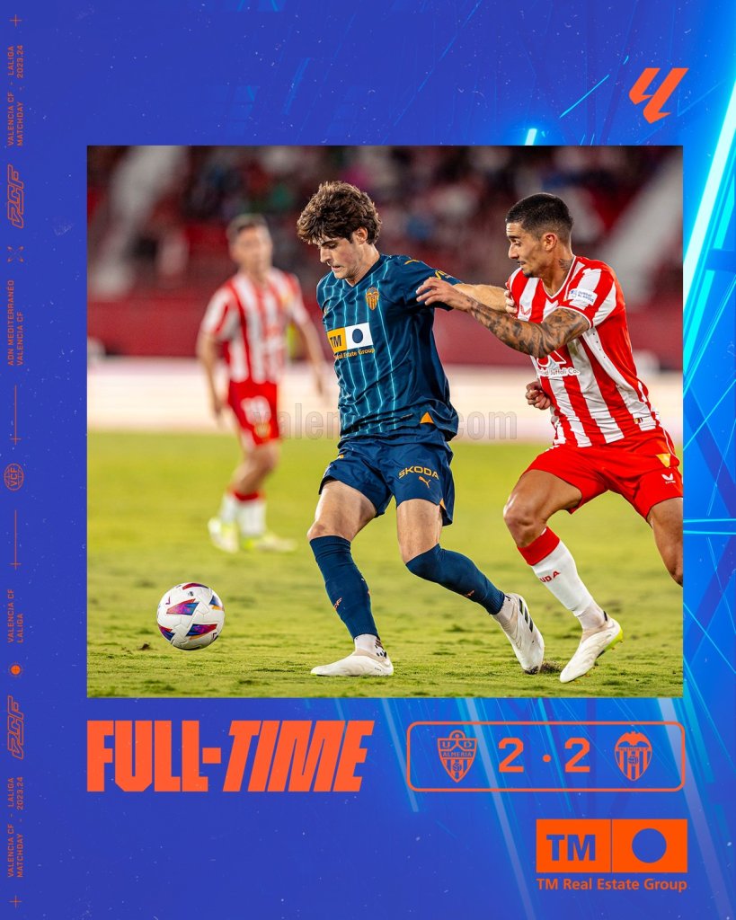 Γκολ και βαθμούς μοιράστηκαν Αλμερία και Βαλένθια για την 6η αγωνιστική της La Liga, καθώς αναδείχθηκαν ισόπαλες 2-2. Στους 10 βαθμούς οι «Νυχτερίδες», παραμένουν στην τελευταία θέση της βαθμολογίας οι γηπεδούχοι με δύο βαθμούς.