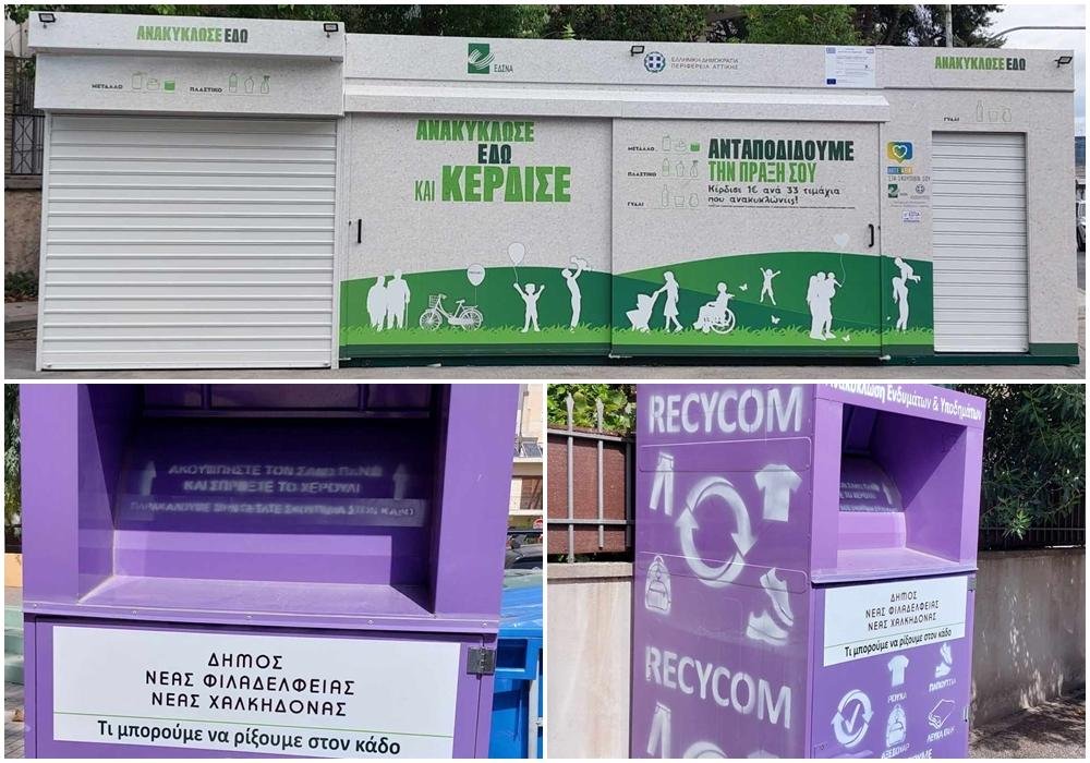 Από τις αρχές Σεπτεμβρίου ο Δήμος συμμετέχει επίσης στο πρόγραμμα του ΕΔΣΝΑ τοποθετώντας δύο (2) «σπιτάκια» ανταποδοτικής ανακύκλωσης, στα οποία μπορούμε να απορρίπτουμε μέταλλο, πλαστικό, χαρτί και γυαλί. Τα πολυκέντρα έχουν τοποθετηθεί επί των οδών Βρυούλων & Ν. Τρυπιά στη Νέα Φιλαδέλφεια και επί των οδών Αχαρνών & Μακρυγιάννη στη Νέα Χαλκηδόνα.