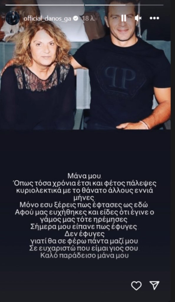 «Μάνα μου. Όπως τόσα χρόνια έτσι και φέτος πάλεψες κυριολεκτικά με τον θάνατο άλλους εννιά μήνες. Μόνο εσύ ξέρεις πώς έφτασες ως εδώ. Αφού μας ευχήθηκες και είδες ότι έγινε ο γάμος μας τότε ηρέμησες. Σήμερα μου είπανε πως έφυγες. Δεν έφυγες γιατί θα σε φέρω πάντα μαζί μου. Σε ευχαριστώ που είμαι γιος σου. Καλό παράδεισο μάνα μου» έγραψε ο Γιώργος Αγγελόπουλος.