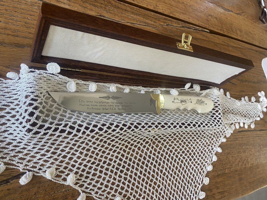 Ο Ματίας Αλμέιδα παρέλαβε ένα υπέροχο δώρο από τον ΣΦ ΑΕΚ Ηρακλείου και συγκεκριμένα ένα παραδοσιακό Κρητικό μαχαίρι. Ένα μαχαίρι το οποίο είχε πάνω μια μαντινάδα αποκλειστικά αφιερωμένη στον Αργεντινό προπονητή. «Εδώ στην Μεγαλόνησο, την όμορφη την Κρήτη, Ματίας είσαι αετός πάνω στον Ψηλορείτη»!