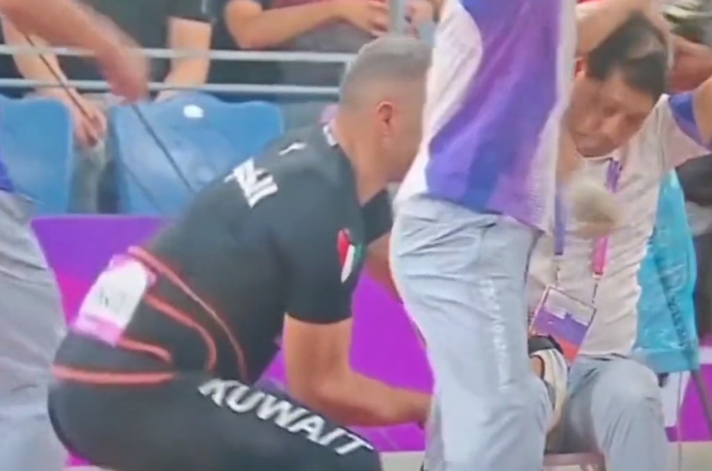 Sędzia techniczny zawodów rzutu młotem Azjatyckich IO doznał poważnych obrażeń nogi po tym, jak reprezentant Kuwejtu Ali Zankawi wypuścił młot w siatkę ochronną. Zawodnik podbiegł natychmiast do sędziego i próbował zatamować krwotok. Chińczyk ma złamaną nogę i przejdzie operację pic.twitter.com/qb7nx0viK9