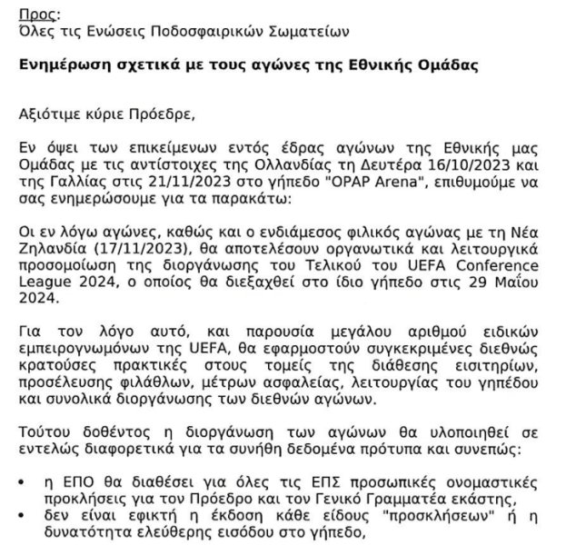 Σε έγγραφο που εστάλη σήμερα στις Ενώσεις Ποδοσφαιτικών Σωματείων η ΕΠΟ αναφέρει ότι στους τρεις αυτούς αγώνες στο νεόδμητο γήπεδο της Νέας Φιλαδέλφειας θα βρίσκονται πολλοί εμπειρογνώμονες της UEFA. Ως εκ τούτου, όπως αναφέρεται στο έγγραφο «η διοργάνωση των αγώνων θα υλοποιηθεί σε εντελώς διαφορετικά για τα συνήθη δεδομένα πρότυπα». Στο πλαίσιο των αλλαγών αυτών, λοιπόν, η ΕΠΟ δεν θα διαθέσει προσκλήσεις στις ΕΠΣ.