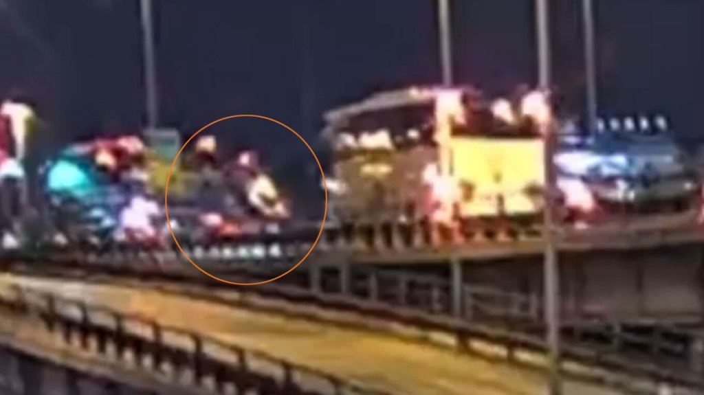 Το λεωφορείο κινείται κανονικά πάνω στη γέφυρα, όταν χάνεται από το πλάνο, καθώς δίπλα του κινούνται άλλα λεωφορεία.