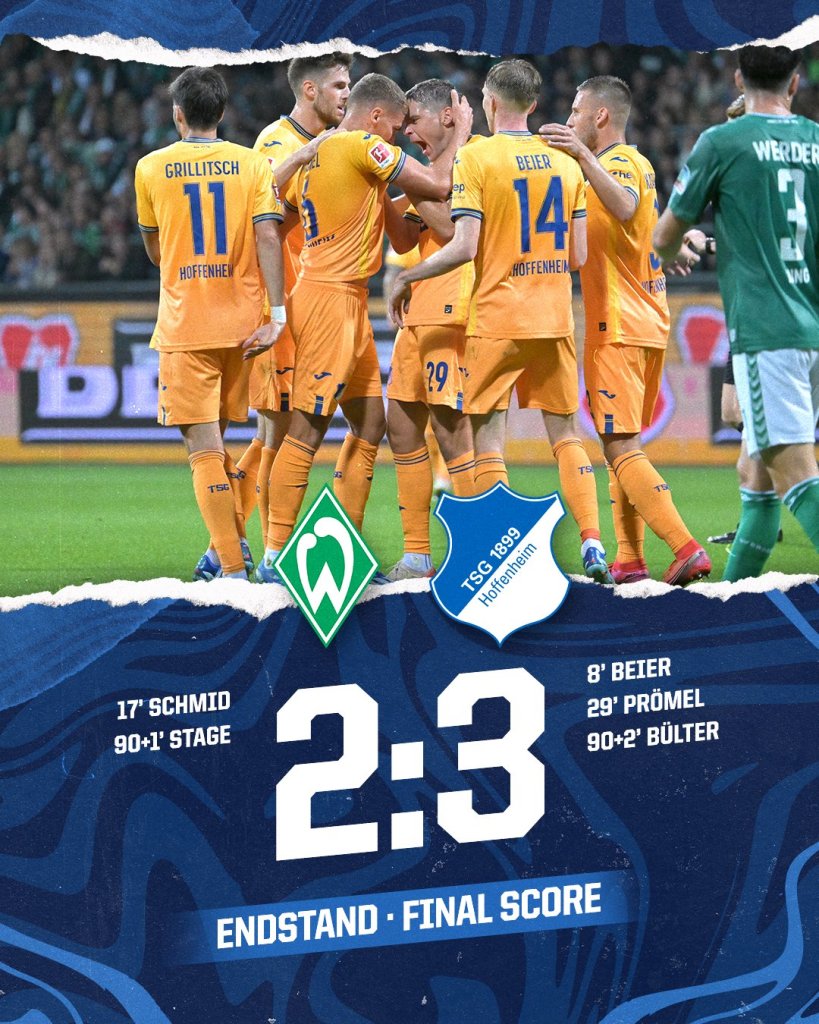 Σε ένα απίθανο παιχνίδι στη Βρέμη, η Χόφενχαϊμ επικράτησε 3-2 της Βέρντερ και ανέβηκε στην 4η θέση της βαθμολογίας με 15 βαθμούς. Ισοφάρισαν στο 90+1’ οι γηπεδούχοι, βρήκαν γκολ νίκης στο 90+2’ οι φιλοξενούμενοι.