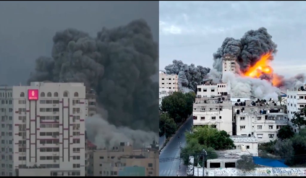 Buildings collapsed after Israeli air strikes rocked the Gaza Strip following a surprise assault that combined gunmen crossing into Israel with a barrage of rockets fired from Gaza https://t.co/z4uQALyMYI pic.twitter.com/JMOxYL0LdH