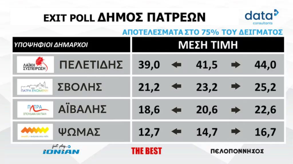 Ο νυν δήμαρχος Πατρέων, Κώστας Πελετίδης, φέρεται να εκλέγεται από την πρώτη Κυριακή σύμφωνα με τα αποτελέσματα του τοπικού exit poll του pelop.gr, της εφημερίδας «Πελοπόννησος» και του peloponnisos FM 104.1 για τον Δήμο Πατρέων και την Περιφέρεια Δυτικής Ελλάδας.