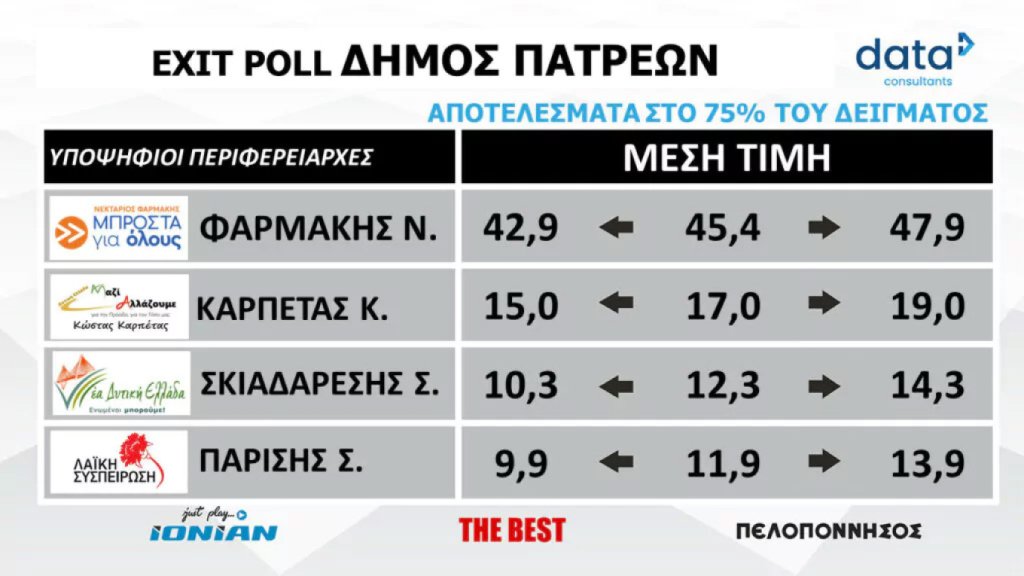 Παράλληλα, την νίκη στην Περιφέρεια Δυτικής Ελλάδας φαίνεται να κατακτά ο κ.Νεκτάριος Φαρμάκης. Το exit poll αφορά στο εκλογικό σώμα στην Πάτρα με αναγωγή σε όλες τις περιφερειακές ενότητες, από την εταιρεία δημοσκοπήσεων DATA Consultants.