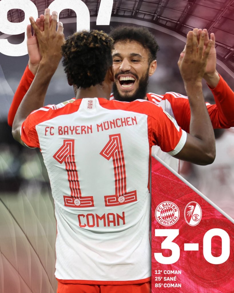Εύκολο απόγευμα για την Μπάγερν. Το σύνολο του Τόμας Τούχελ επικράτησε 3-0 της Φράιμπουργκ στο «Αλιάνζ Αρίνα» και βρίσκεται στο -2 από την πρώτη Λεβερκούζεν. Δύο γκολ για τον Κίνγκσλεϊ Κομάν.