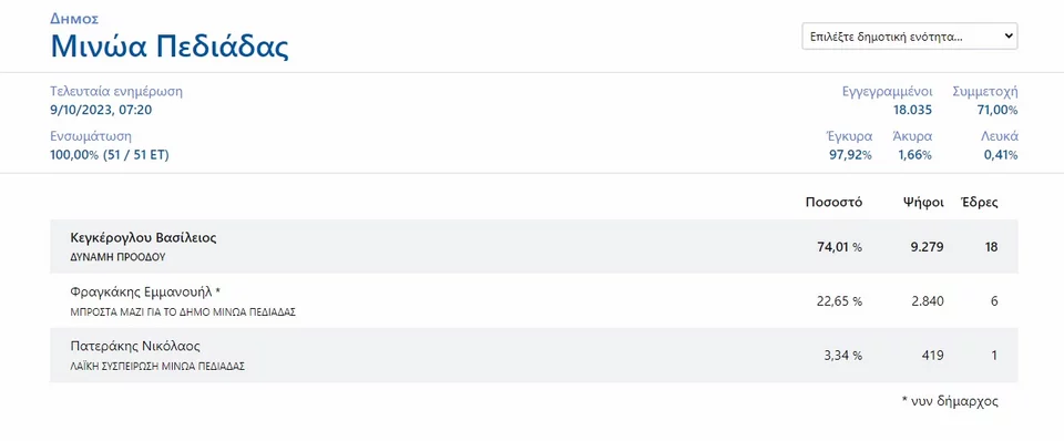 Πανηγυρική είναι η νίκη του κ. Κεγκέρογλου ο οποίος άγγιξε το 74,01% και πλέον είναι δήμαρχος στον Μίνωα Πεδιάδας του νομού Ηρακλείου.
