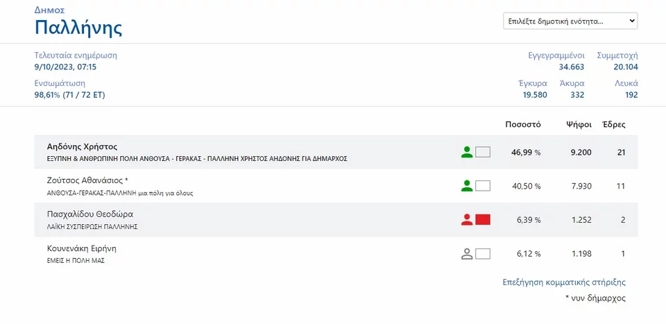 Ο κ. Αηδόνης είναι ο νέος δήμαρχος Παλλήνης, καθώς συγκέντρωσε το 46,99, με την ενσωμάτωση να βρίσκεται στο 98,61%.