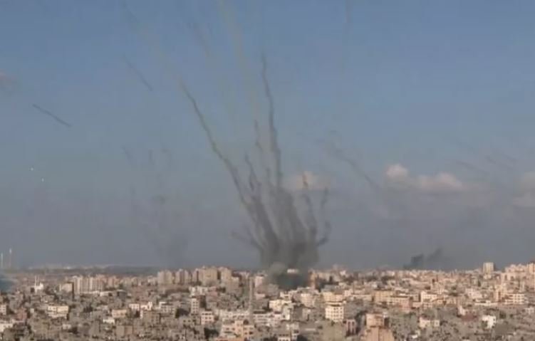 Τη στιγμή της πυραυλικής επίθεσης που εξαπέλυσε η Χαμάς εναντίον της ισραηλινής πόλης Ασκελόν κατέγραψαν ΜΜΕ της περιοχής. Στην εικόνα φαίνεται μία βροχή από πυραύλους να εκτοξεύονται προς την πόλη του Ισραήλ, οι κάτοικοι της οποίας είχαν προειδοποιηθεί από τη Χαμάς να εγκαταλείψουν τα σπίτια τους μέχρι τις 5 το απόγευμα.