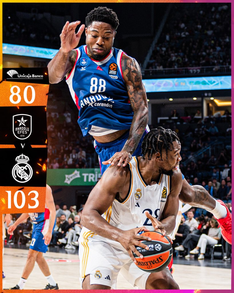 Η Ρεάλ Μαδρίτης έκανε επίδειξη δύναμης μέσα στην Τουρκία κόντρα στην Αναντόλου Εφές την οποία κέρδισε με 103-80, διπλασιάζοντας έτσι τις νίκες της στην διοργάνωση. Εκπληκτική εμφάνιση από τους Κοζέρ και Γιαμπουσέλε.