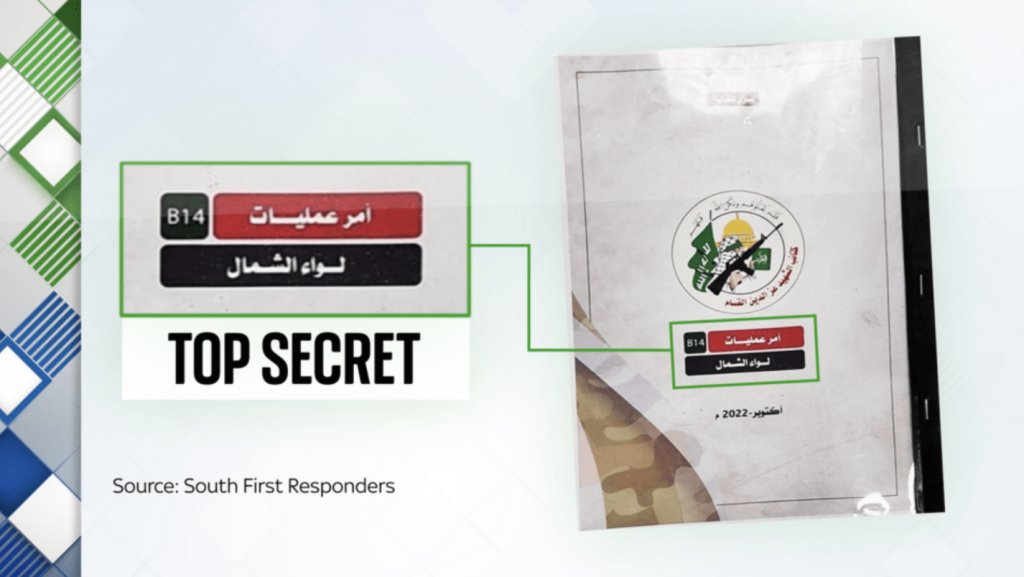 Σε άλλη σελίδα με χάρτη που έχει τίτλο “Top Secret Maneuver” η Χαμάς περιγράφει σε μονάδα να ασφαλίσει την έφοδό της στο Κφαρ Σαάντ στα ανατολικά, ενώ άλλη μονάδα θα ελέγχει την δυτική πλευρά. Αναφέρουν πάλι η φράση «σκοτώστε όσους μπορείτε και πάρτε ομήρους»