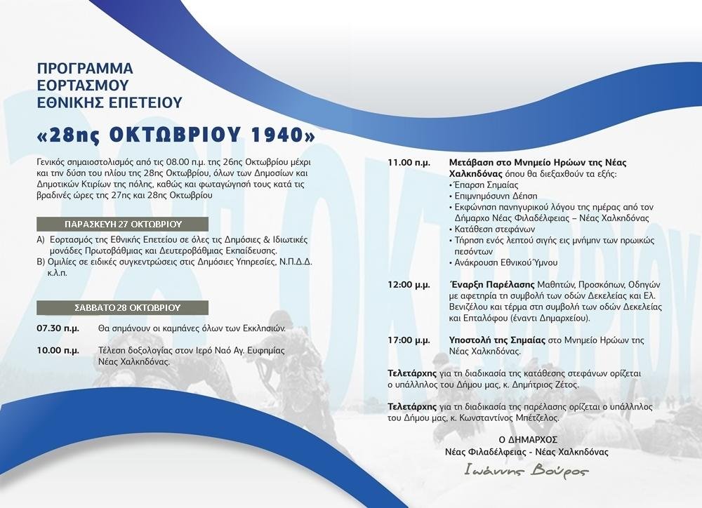- 12:00 μ.μ. Έναρξη Παρέλασης Μαθητών, Προσκόπων, Οδηγών, με αφετηρία τη συμβολή των οδών Δεκελείας και Ελ. Βενιζέλου και τέρμα στη συμβολή των οδών Δεκελείας και Επταλόφου (έναντι Δημαρχείου).