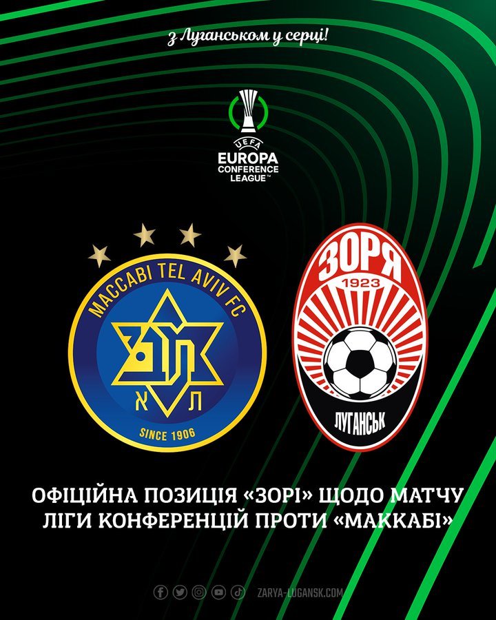 Η Μακάμπι Τελ Αβίβ αντιμετωπίζει εντός έδρας τη Ζόρια στις 26 Οκτωβρίου για το Conference League και οι Ισραηλινοί θέλουν να αναβληθεί το παιχνίδι. Παρόλα αυτά, η ουκρανική ομάδα απάντησε αρνητικά, ζητώντας είτε διεξαγωγή σε διαφορετική έδρα είτε αντιστροφή της σειράς των αγώνων.