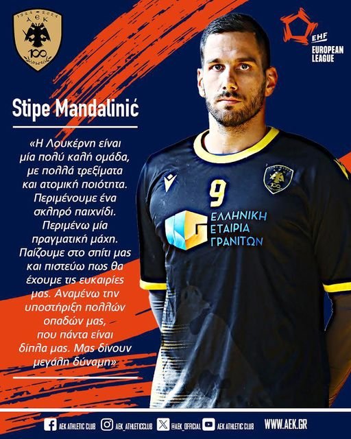 Ο Στίπε Μαντάλινιτς μίλησε για το ευρωπαϊκό παιχνίδι της Τρίτης με την Κριενς και τόνισε πως η ΑΕΚ περιμένει ένα σκλήρό παιχνίδι, αλλά χρειάζεται σε αυτό την στήριξη των οπαδών της. «Η Λουκέρνη είναι μια πολύ καλή ομάδα με πολλά τρεξίματα και ατομική ποιότητα. Περιμένουμε ένα σκληρό παιχνίδι. Περιμένω μια πραγματική μάχη. Παίζουμε στο σπίτι μας και πιστεύω πως θα έχουμε τις ευκαιρίες μας. Αναμένω την στήριξη των οπαδών μας που πάντα είναι δίπλα μας. Μας δίνουν μεγάλη δύναμη».